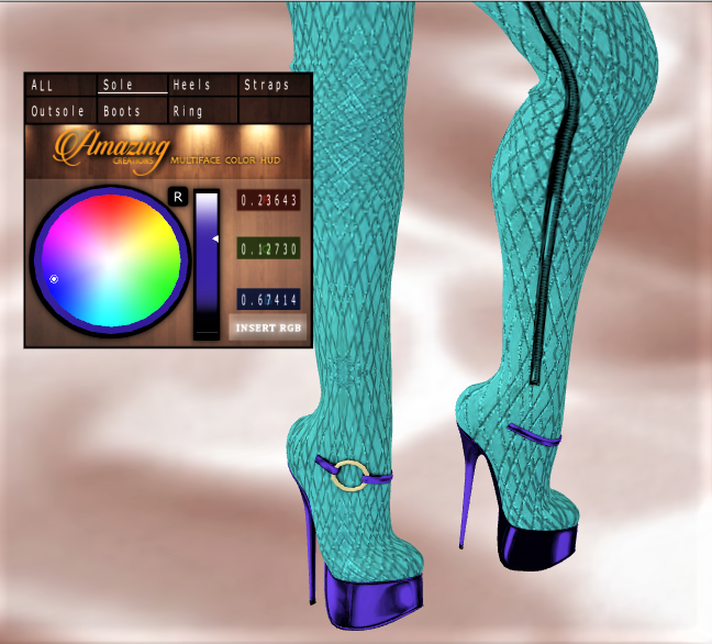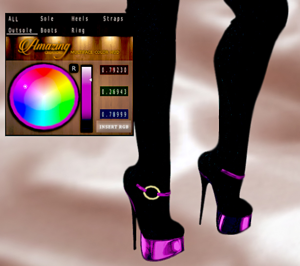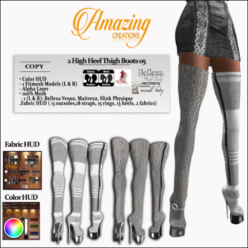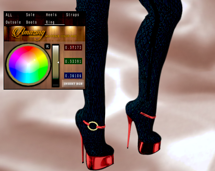 They’re Copy only; however, with the AmAzInG CrEaTiOnS Fabric and Colour Hud the combination of styles and colours are endless! You can choose the mesh/lace fabric or metallic inlaid/faux leather and also detail in colour each part of the boots (All, Sole, Heel, Straps, Outsole, Boots and Ring)