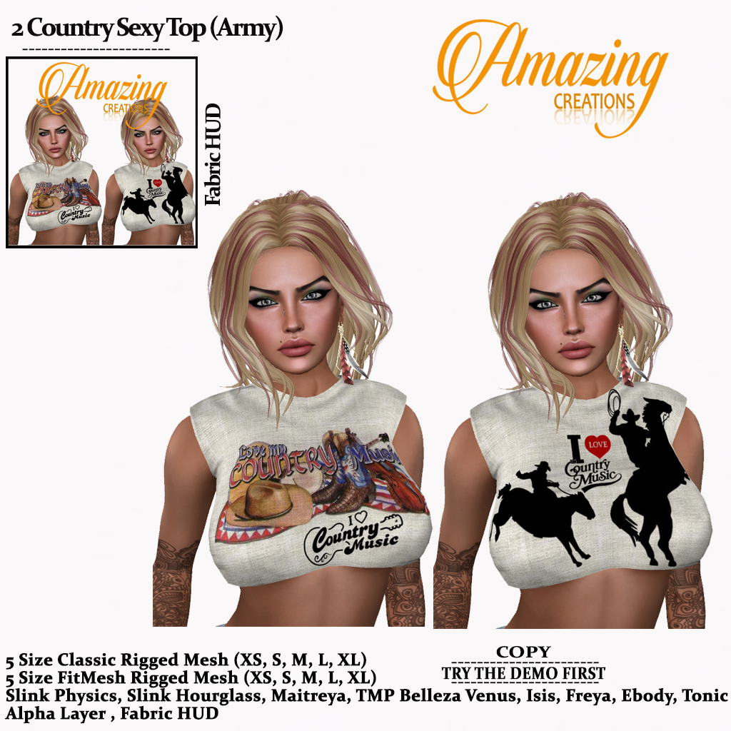 Hello valued readers and subscribers! Welcome back to my review for AmAzInG CrEaTiOnS Country Sexy Top by that incredible seamstress of virtual mesh,πΉ kalliopi ZiplonπΉ, owner of AmAzInG CrEaTiOnS!